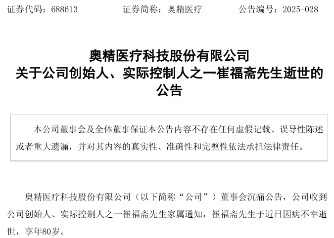 奥精医疗(688613)6月16日晚间发布公告,公司董事会沉痛公告,公司收到公司创始人、实际控制人之一崔福斋先生家属通知,崔福斋先生于近日因病不幸逝世,享年80岁。